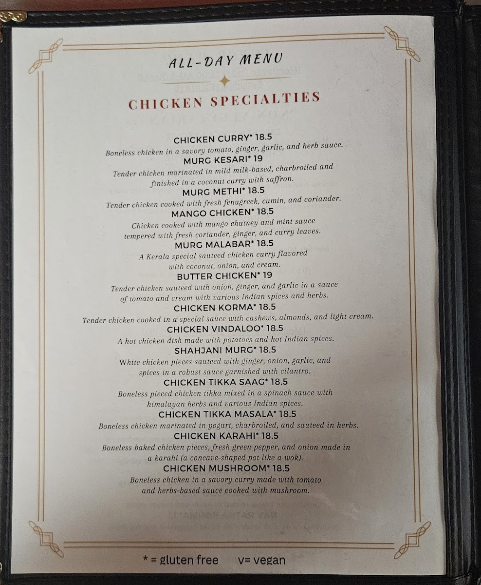 Chicken cooked with mango chutney and mint sauce tempered with fresh coriander, ginger, and curry leaves.