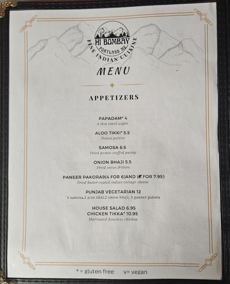 Mixed platter of appetizers; one piece each of samosa, aloo tikka, pakora, paneer pakora, and papadam.