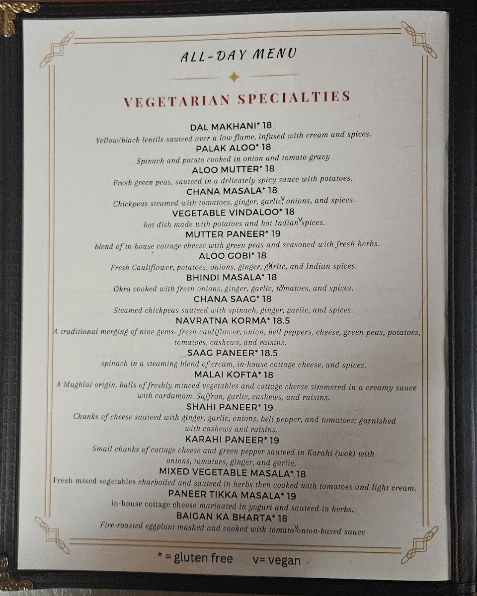 A traditional merging of nine gems-fresh cauliflower, eggplant, green peppers, homemade cheese, green peas, potatoes, tomatoes, cashews, and raisins.